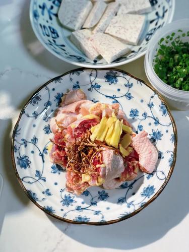 “某秋日,一家三口去看稻穀梯田,中午在半山腰一個不起眼的地方發現一家農莊。意外吃了五指毛桃蒸雞,老闆特意給我們加了瀨粉漿一起蒸,新鮮的食材用最樸素的方式呈現,那個滋味讓我回家總想復刻一次。沒有瀨粉,我用粉粉的芋頭鋪在底部,五指毛桃的奶香味和雞肉的鮮甜相融合,吸收雞汁的芋頭鹹香好滋味~”