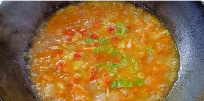 【步驟六】:南瓜和土豆煮熟,放入青紅椒,開始調味,依次放入小米辣2個、鹽1勺、胡椒粉1勺、松茸鮮1勺。