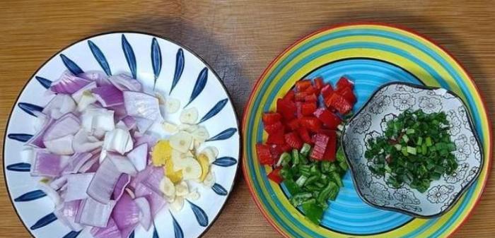 【步驟二】:把洋蔥切成小塊、大蒜和生薑都切成片、香蔥切成末、甜椒和青椒切成小顆粒,然後分別裝盤備用。