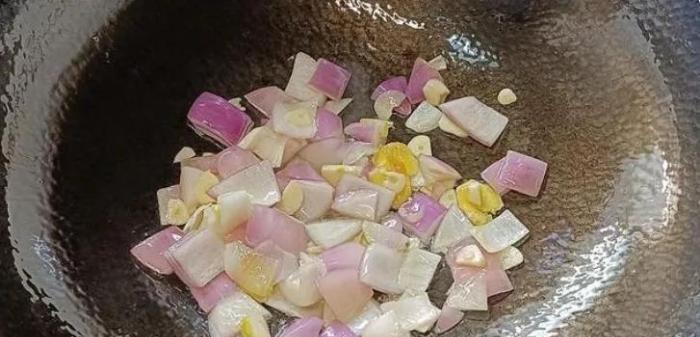 【步驟三】:鍋中放入一勺油燒熱,放入生薑、洋蔥、蒜片,小火炒出香味。