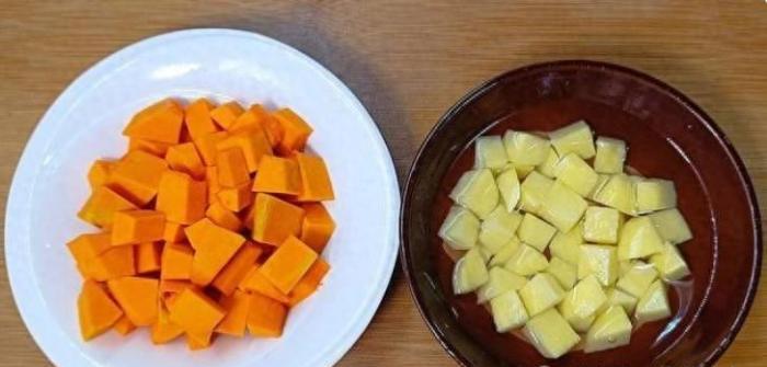 【步驟一】:把南瓜切成小塊、土豆也切成小塊,然後分別裝盤備用。