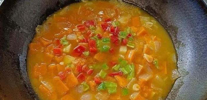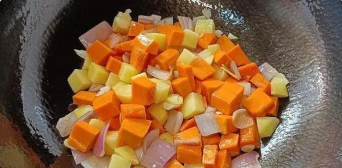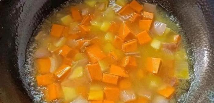 (3)南瓜和土豆洋蔥都要先炒一下,這樣燉煮出來的湯味道才香,而且味美。