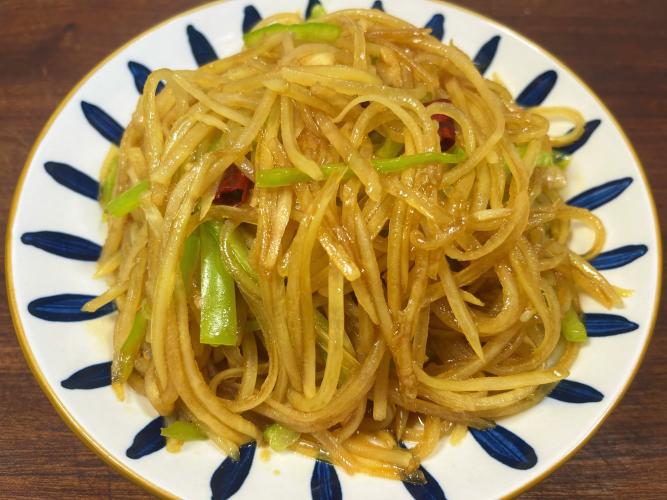 熱油爆香乾辣椒段,土豆絲瀝水下鍋,猛火翻炒到透明;