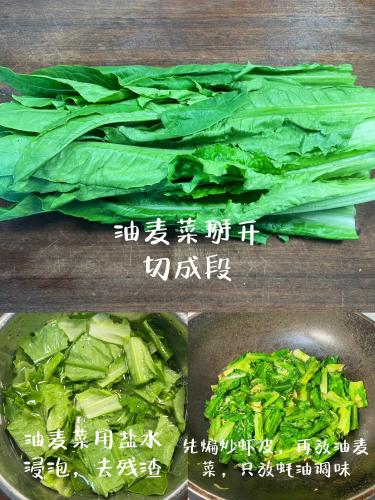 蝦皮溫水泡5分鐘擠幹,油麥菜掰成段;