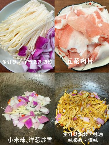 金針菇撕小把下鍋炒軟,倒回肉片,加蠔油、半勺老抽猛火快炒;