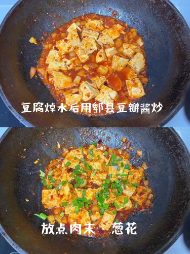 加半碗開水,撒花椒粉,豆腐塊輕輕滑進鍋裡,中火咕嘟5分鐘;