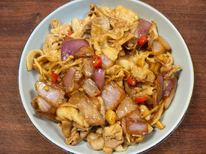 肉片炒金針菇:滑溜溜的金針菇掛著醬汁,紫洋蔥甜絲絲的,專偷米飯的"賊"!