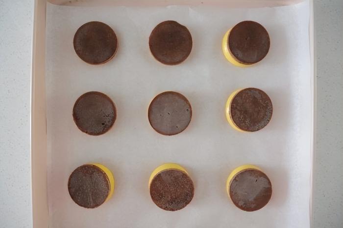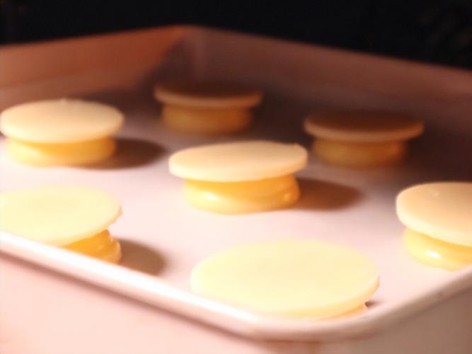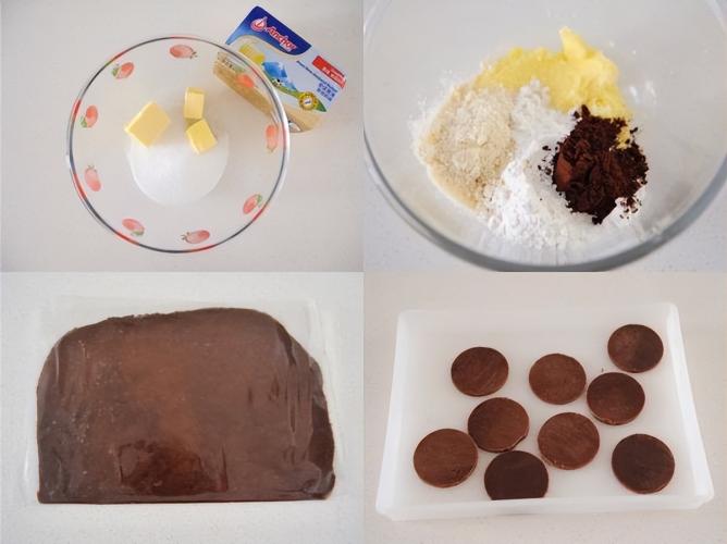 先做個酥皮:黃油要在室溫的情況下融化,隨後砂糖放進去和它融為一體,看不到砂糖粒就可以了。把低筋麵粉還有可可粉杏仁粉和黃油混合在一起。桌面鋪一層油紙,擀麵杖給酥皮擀得薄薄的,然後圓形模具分割成這樣的小圓片,放冷凍裡,讓它凍得硬硬的。