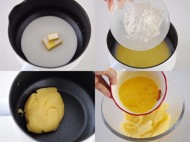 泡芙外皮:牛奶 85克、黃油 37克、白糖 3克、鹽 0.5克、低筋麵粉58克、生雞蛋(正常溫度)110克、