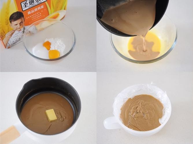 先做可以爆漿的拿鐵餡,好不好吃一大部分取決於這個餡,準備個碗,蛋黃和砂糖加上玉米澱粉,攪拌均勻沒有疙瘩。先用小鍋把椰漿和咖啡煮沸了,然後放蛋黃糊,開小火,用膠鏟給它不斷攪和,讓它變得特別粘稠就可以了,這時候黃油放進去,不斷攪,全部融一起了,就可以,最好過個篩子,然後就可以放冰箱裡冷藏降溫了。蓋層保鮮膜防止竄味。