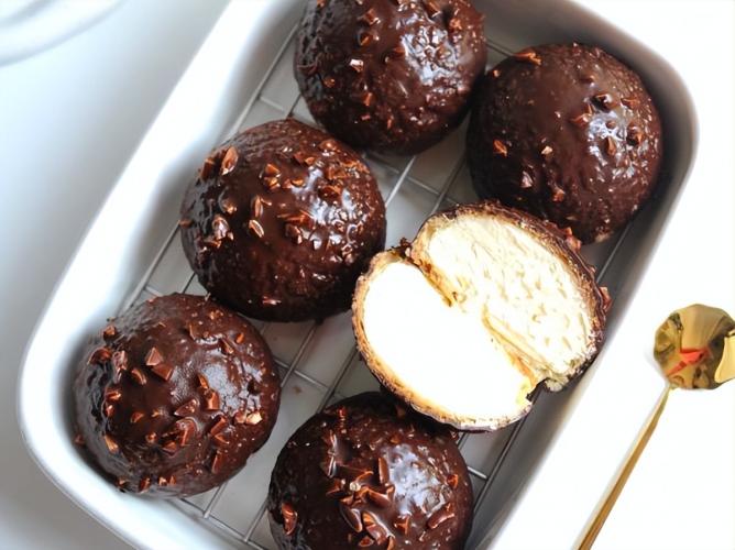 烤好的泡芙皮都鼓起來了,弄個小口,把做好的奶油餡擠裡面就可以享用啦。