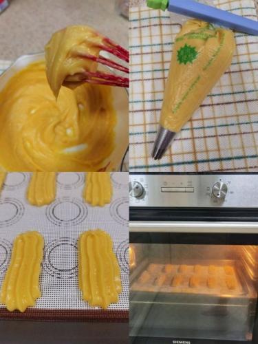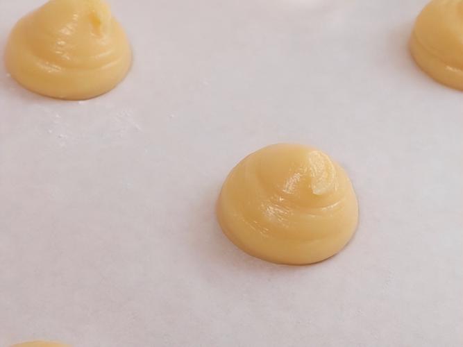 烤盤放好油紙,把裱花袋裡麵糊糊擠成圖中這個樣子。200度的烤箱,放進去烤,注意每個之間的距離,因為會膨脹。先用200度烤個十分鐘再轉到180度的溫度烤個15分鐘,關火在裡面讓它降溫兩分鐘就好了。