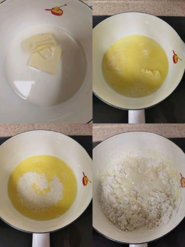 隨後把不粘鍋預熱一下,倒入牛奶然後把鹽,糖,黃油加進去,小火等到黃油融化了,這時候低筋麵粉就可以倒裡面了,拿著膠鏟不斷的攪拌,讓裡面沒有乾粉就可以了。