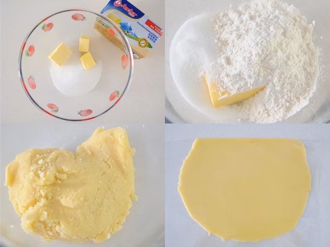 先把酥皮做了,黃油用室溫給它放融化了,然後加上低筋麵粉,砂糖放進去,攪和成麵糊糊,桌子上鋪一層油紙或者保鮮膜,給它用擀麵杖擀成薄薄的餅皮。記住是放冰箱裡去冷凍,讓它變得硬硬的。