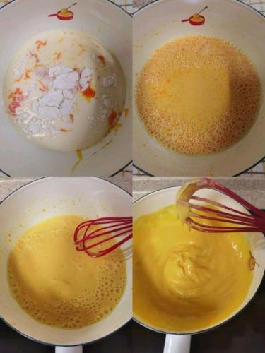 奶油:雞蛋黃2個、木糖醇30克、牛奶 150克、低筋麵粉15克,淡奶油110克