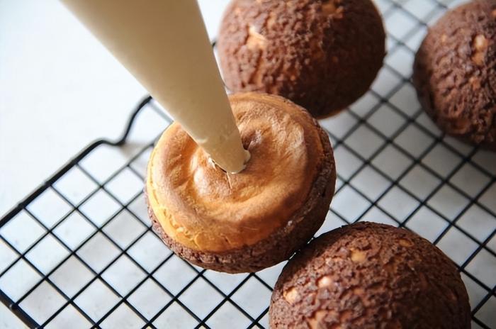烤好的泡芙皮裡面是空的又很脆,這時候選擇在泡芙的底部戳個小洞,裱花袋口對準泡芙底部,擠入奶油,就大功告成了